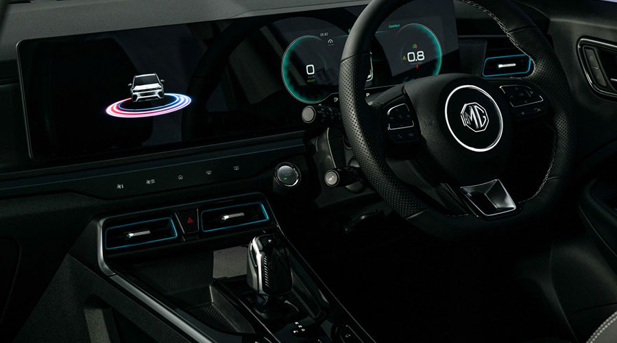 Interior yang tersemat pada MG VS HEV, dimulai dari Dual Widescreen Cockpit, Full Virtual Dashboard berukuran 12.3 inci, serta setir yang telah didukung fitur power steering guna memudahkan manuver selama perjalanan menjadi lebih dinamis